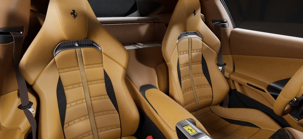 Ce qui est frappant, c’est de constater à quel point un intérieur Ferrari est immédiatement reconnaissable. Il suffit d’un certain contraste entre un ensemble majoritairement noir et une signalétique faite de lettrages et – surtout ! – de chiffrages blancs, de détails jaunes et rouges, à laquelle on associera des éléments métalliques et du cuir, pour qu’on sache d’emblée qu’on est dans un intérieur maranellois. Si on fait face au tableau de bord, on a sans doute du mal à discerner un lien entre la Daytona et la 12 cilindri. En revanche, il suffit d’inverser la perspective, et de regarder les sièges pour deviner la filiation qui unit ces deux modèles. Si on choisit les sièges Racing, on pourrait dire que dans la nouvelle Ferrari, on s’assoit dans un exosquelette épousant les formes du corps, comme si le dossier et l’assise étaient un écho de l’ossature de celui ou celle qui s’y installe. Amplement ajouré, le siège est réduit à sa plus simple expression, comme si on en avait exclusivement matérialisé les parties qui prennent en charge le contact avec le corps, tout le reste étant évidé pour ne garder que l’essentiel. Mais on veut un look plus Daytonien, on peut opter pour une finition précisément nommée « Daytona », proposée en format « standard » ou « racing », dont les empiècements et les surpiqures, sur le dossier et l’assise, reprennent le motif historique. On doit pouvoir, en recourant au service de personnalisation, accéder à des empiècements contrastés, en mode old school.
